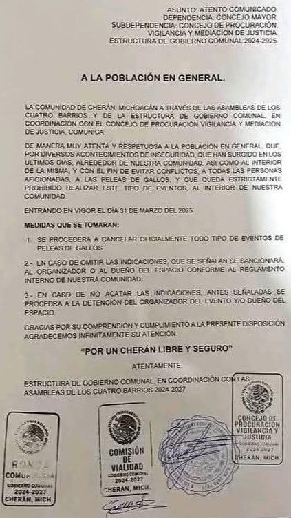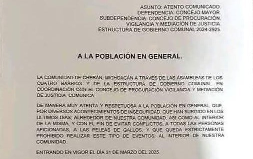 La comunidad de Cherán dio a conocer, mediante un comunicado oficial, la cancelación definitiva de toda actividad vinculada con las peleas de gallos, al considerar esta práctica como incompatible con los principios de respeto animal que sostiene el gobierno comunal.