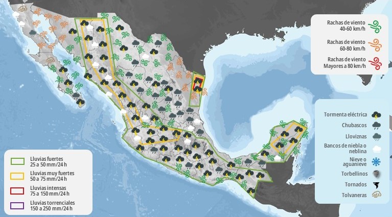 Mesa del Norte: Cielo medio nublado a nublado durante el día, con lluvias puntuales muy fuertes en Chihuahua y Durango, así como fuertes en Zacatecas, acompañadas con fuertes rachas de viento y posible caída de granizo. Chubascos en Coahuila, Nuevo León, San Luis Potosí y Aguascalientes. Todas las lluvias con descargas eléctricas. Por la mañana, ambiente templado a cálido en la región, y frío con temperaturas menores a 5 °C en sierras de Chihuahua y Durango. Durante la tarde ambiente cálido a caluroso en la región, y muy caluroso en el noreste de Chihuahua y este de Nuevo León. Viento del sureste de 20 a 30 km/h con rachas de 40 a 60 km/h en Chihuahua, Coahuila, Nuevo León, Tamaulipas, Durango, Zacatecas y San Luis Potosí, y de 10 a 25 km/h con rachas de 30 a 40 km/h en Aguascalientes.