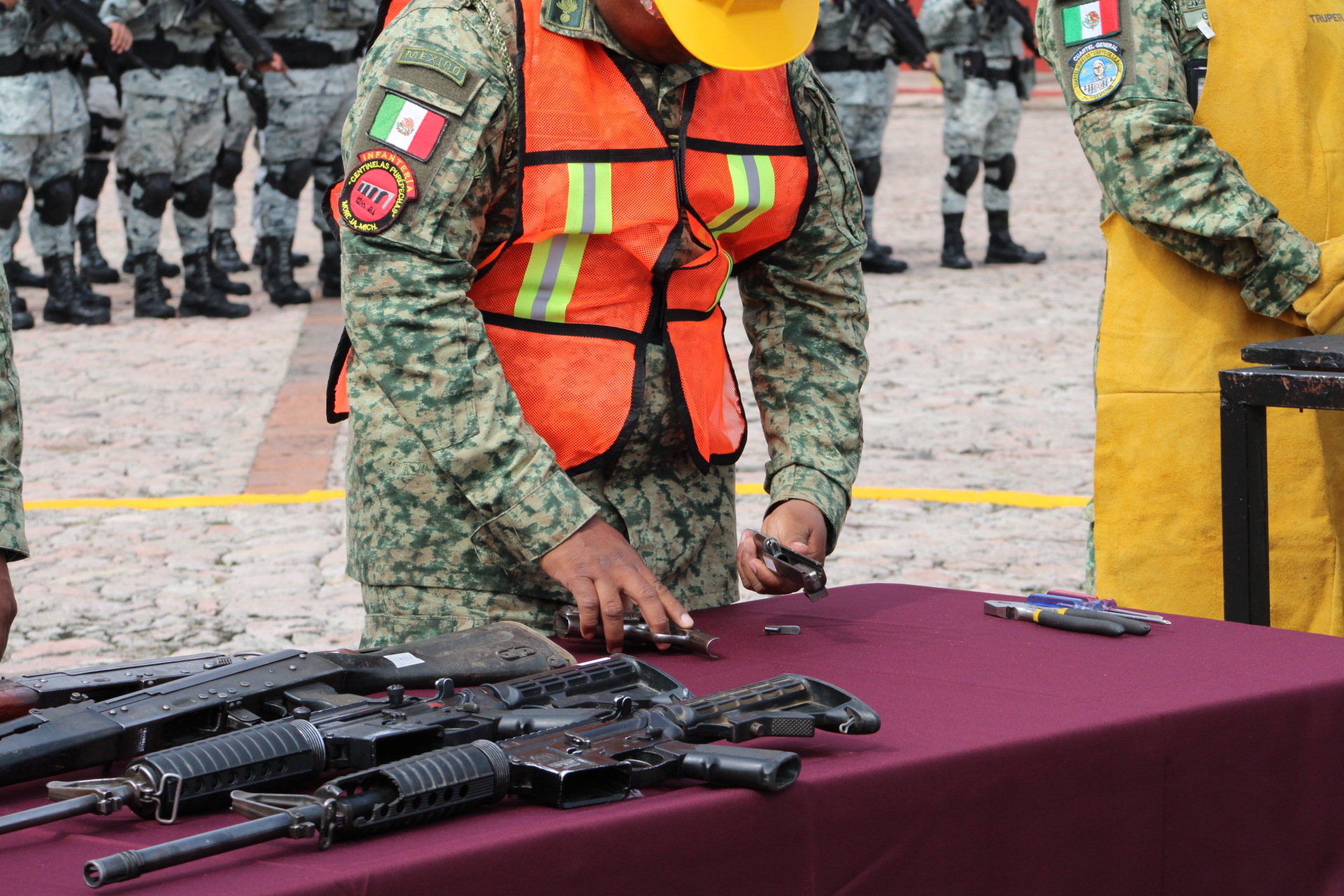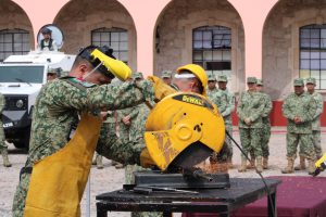 En las instalaciones del Cuartel Morelos, personal militar realizó la destrucción de armamento que ha sido decomisado a grupos delictivos o canjeado a través de las campañas de canje de armas en el periodo de abril a la fecha.