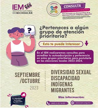En días pasados en Sesión de Consejo General del Instituto Electoral de Michoacán (IEM) la realización de Consultas previas, libres, informadas y de buena fe a personas con discapacidad, de la población LGBTIAQ+, indígenas y migrantes, sobre la acreditación de su autoadscripción, pertenencia o vinculación a esos grupos de atención prioritaria para la postulación de candidaturas en el Proceso Electoral Local 2023-2024, así como los cuestionarios a aplicar en la misma.