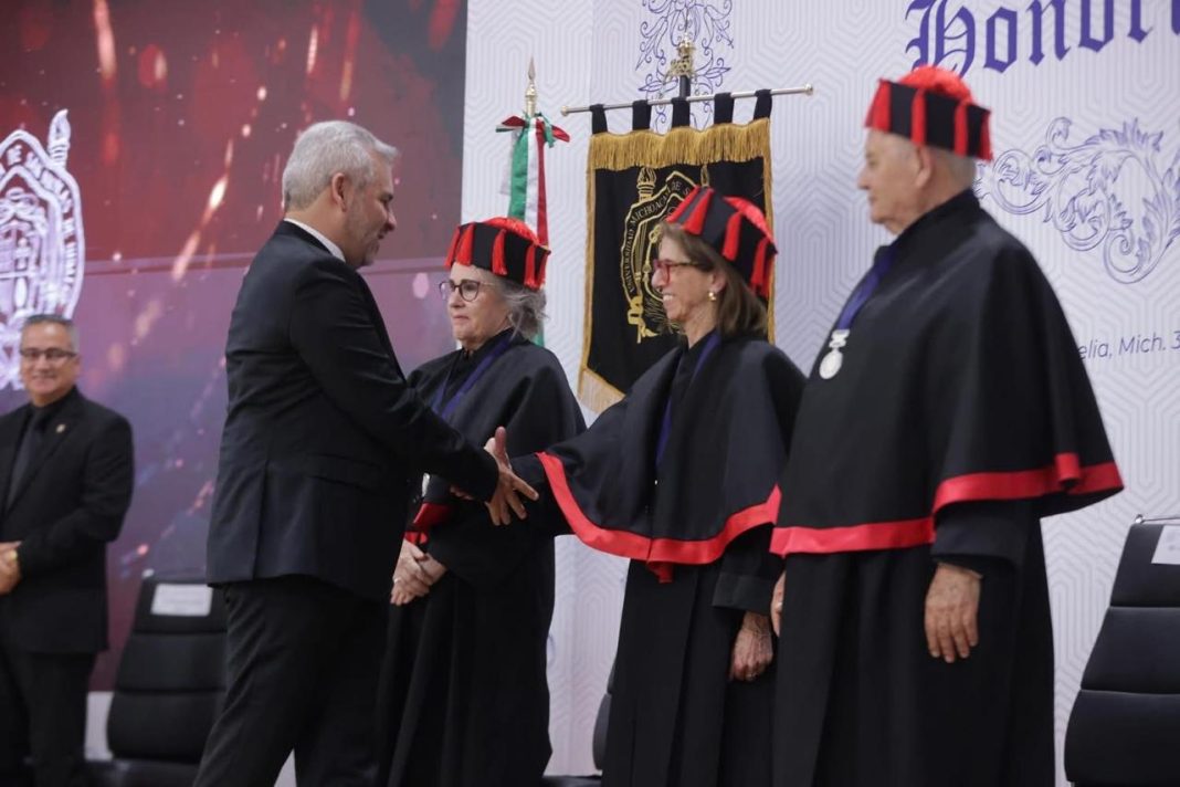 “Participar en este acto solemne es motivo de profundo honor y emoción. No solo honra sus trayectorias, sino que también reafirma el compromiso de la Universidad Michoacana con el conocimiento, la igualdad y la libertad de pensamiento. Mi compromiso con la Universidad se refleja en la reforma constitucional de noviembre de 2024 donde se le otorga autonomía plena”, dijo.