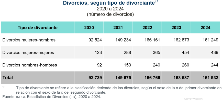 Se registraron 161 249 divorcios entre parejas constituidas por una mujer y un hombre; 439 entre las constituidas solo por mujeres y 244 entre las formadas solo por hombres. De 2020 a 2024, los casos con divorciantes del mismo sexo se incrementaron: los divorcios entre mujeres han sido superiores a los divorcios entre hombres.