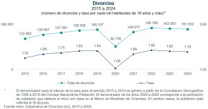 La tasa de divorcios por cada mil habitantes de 18 años y más pasó de 1.52, en 2015, a 1.79, en 2024. El año 2020, que coincidió con el inicio de la pandemia por la COVID-19, presentó una disminución respecto a 2019, y también fue inferior a la de 2015.