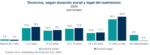 Entre los matrimonios que se disolvieron legalmente, 33.8 % tuvo una duración legal de 21 años y más; 19.4 %, de 1 a 5 años; 15.1 %, de 6 a 9 años; 17.9 %, de 10 a 15 años; 11.7 %, de 16 a 20 años y 1.6 % fue menor a 1 año.