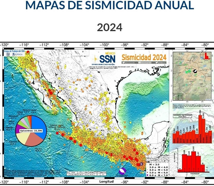 Según estadísticas del Servicio Sismológico Nacional (SSN), durante el año pasado se registraron 33 mil 396 movimientos sísmicos en México, con magnitudes que oscilaron entre 0.6 y 6.2 grados.