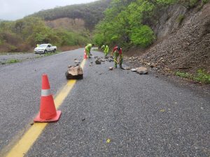 En el acceso carretero Playa Azul-Manzanillo, cuadrillas de la Secretaría de Comunicaciones y Transportes de Michoacán (SICT) retiraron rocas y lodo de varios tramos cercanos a los límites de Michoacán con Colima, resultado de deslaves provocados por la saturación de los cerros.