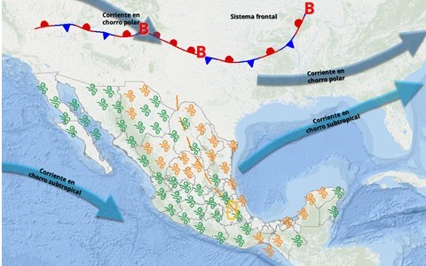 Mesa del Norte: En el transcurso del día, cielo despejado a medio nublado, sin lluvia en Chihuahua, Coahuila, Nuevo León, Durango, Zacatecas y Aguascalientes. Por la mañana, ambiente frío, con temperaturas de 0 a 5 °C y posibles heladas en zonas de Aguascalientes, muy frío con heladas en sierras de Coahuila, Nuevo León, Zacatecas y San Luis Potosí, así como ambiente gélido con heladas en zonas serranas de Chihuahua y Durango, siendo fresco en la mayor parte de Nuevo León y en el oriente de Coahuila. Durante la tarde, ambiente cálido, con temperaturas de 30 a 35 °C en zonas de Zacatecas y Aguascalientes, siendo caluroso en zonas de Chihuahua, Durango, Coahuila, Nuevo León y San Luis Potosí; incremento de nubosidad con lluvias aisladas y posibles descargas eléctricas en San Luis Potosí. Viento de componente sur de 20 a 40 km/h con rachas de 50 a 70 km/h y posibles tolvaneras en Coahuila y Nuevo León; viento de componente oeste de 20 a 30 km/h con rachas de 50 a 70 km/h y tolvaneras en Chihuahua, Durango, San Luis Potosí y Zacatecas, así como de 40 a 60 km/h en Aguascalientes.