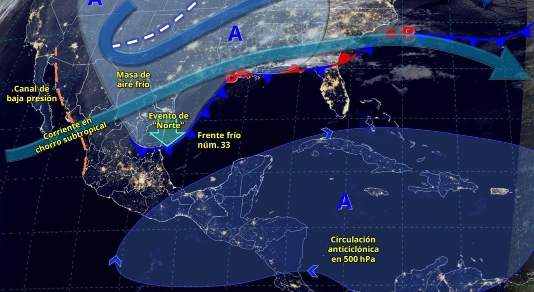 Para este día, el frente frío núm. 33 se desplazará sobre el litoral del golfo de México, originando lluvias puntuales intensas en zonas de Tabasco y Chiapas, muy fuertes en Oaxaca y Veracruz (sur), fuertes en Campeche, además de chubascos en Puebla, Yucatán y Quintana Roo. La masa de aire frío asociada al sistema frontal, propiciará descenso de temperatura en el norte, noreste y oriente del país, así como evento de «Norte» con rachas de viento de 80 a 100 km/h en Tamaulipas, Veracruz, istmo y golfo de Tehuantepec, y de 50 a 70 km/h durante la tarde-noche en Tabasco, Campeche y Yucatán.