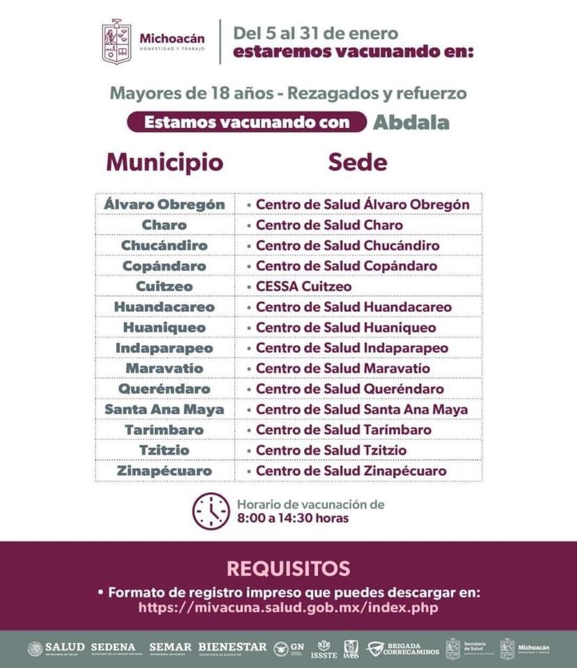 Morelia, Michoacán.- Michoacán mantiene inmunización anti COVID-19 dirigida a población mayor de 18 años con rezago y que requiere su refuerzo con el biológico Abdala.