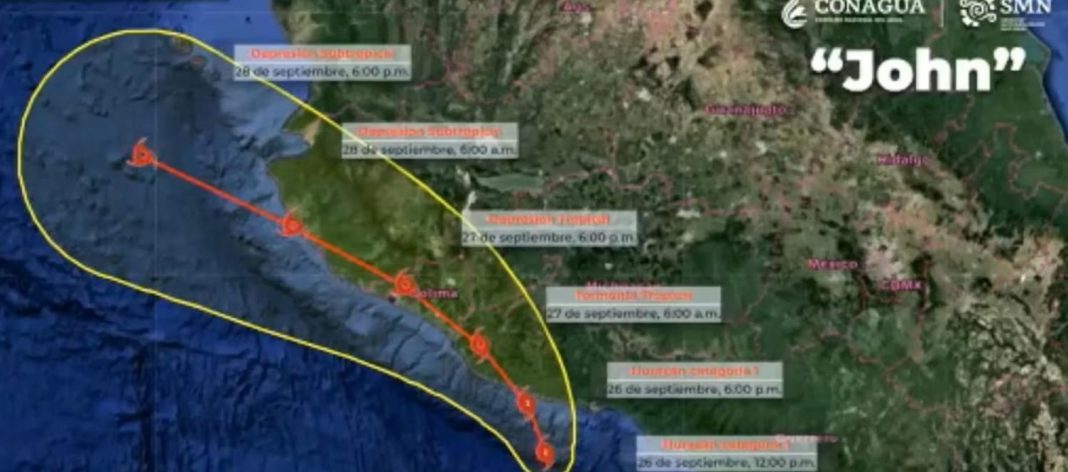 Según la Conagua de la que depende el SMN, la zona que se mantiene en alerta por efectos de la tormenta tropical John abarca desde Punta Maldonado, Guerrero, hasta Manzanillo, Colima, y por su amplia circulación se prevén lluvias puntuales extraordinarias superiores a 250 mm en Colima, Michoacán y Guerrero, como lluvias puntuales torrenciales (150 a 250 mm) en Jalisco y Oaxaca. Además, refuerza la probabilidad de lluvias fuertes a puntuales intensas en el centro y oriente del país.