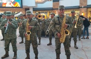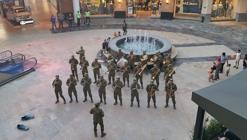 Esta tarde de miércoles, personal militar llevó música a la plaza comercial sorprendiendo a sus visitantes, quienes fueron testigos como desde diversas áreas de la plaza los soldados aparecían con diferentes instrumentos musicales.