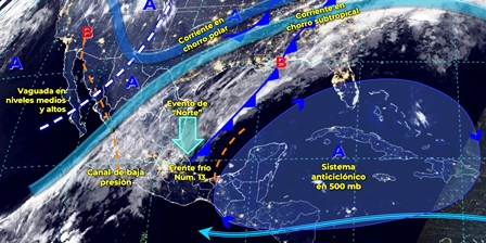 Este día, el frente frío Núm. 13 se extenderá como estacionario sobre el sureste de la República Mexicana, la Sonda de Campeche y el centro del país, continuará interactuando con el ingreso de humedad generado por la corriente en chorro subtropical, produciendo lluvias intensas a puntuales torrenciales en Veracruz, Chiapas y Tabasco; lluvias muy fuertes a puntuales intensas en Puebla, Oaxaca, Campeche y Yucatán; así como chubascos y lluvias fuertes sobre entidades del noreste, centro y oriente del territorio nacional.
