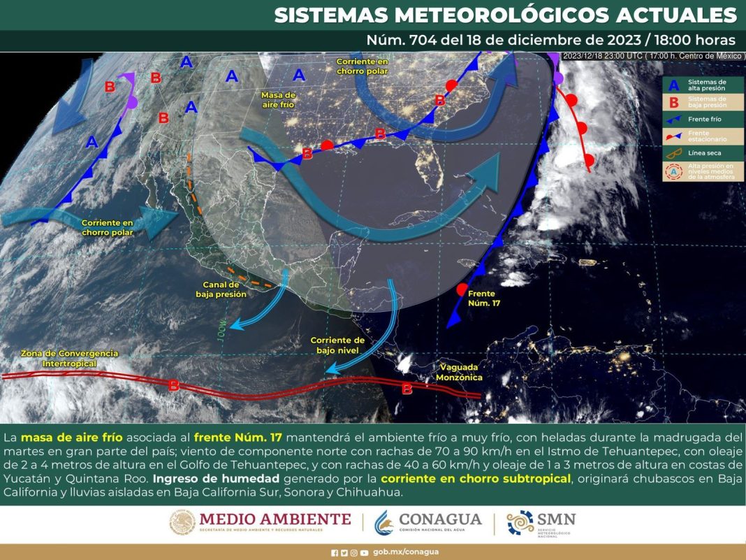 De acuerdo con el Servicio Meteorológico Nacional (SMN), la masa de aire frío, asociada al sistema frontal número 17, mantendrá el ambiente matutino y nocturno frío a muy frío, con heladas de 0 a 5 grados Celsius en regiones montañosas, así como lluvias aisladas en el estado.