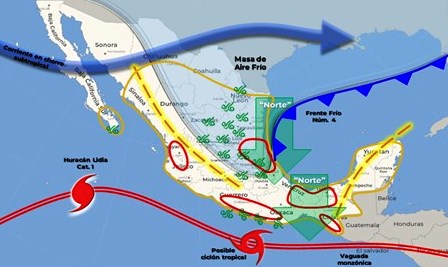 El ingreso de humedad proveniente del Mar Caribe, generará lluvias puntuales muy fuertes en Yucatán y Campeche y puntuales fuertes en Quintana Roo. Finalmente, la tormenta tropical Lidia se desplazará lentamente al sur de la Península de Baja California, por lo que su extensa circulación ocasionará lluvias puntuales fuertes en Baja California Sur y reforzará la probabilidad de lluvias puntuales muy fuertes a intensas en los estados del Pacífico Central Mexicano.