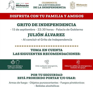 El Gobierno de Michoacán invita a la población a disfrutar en familia y amigos, la celebración del Grito, con motivo del 213 aniversario del inicio de la Independencia, así como del concierto gratuito que ofrecerá Julión Álvarez en el Centro Histórico de la capital michoacana.