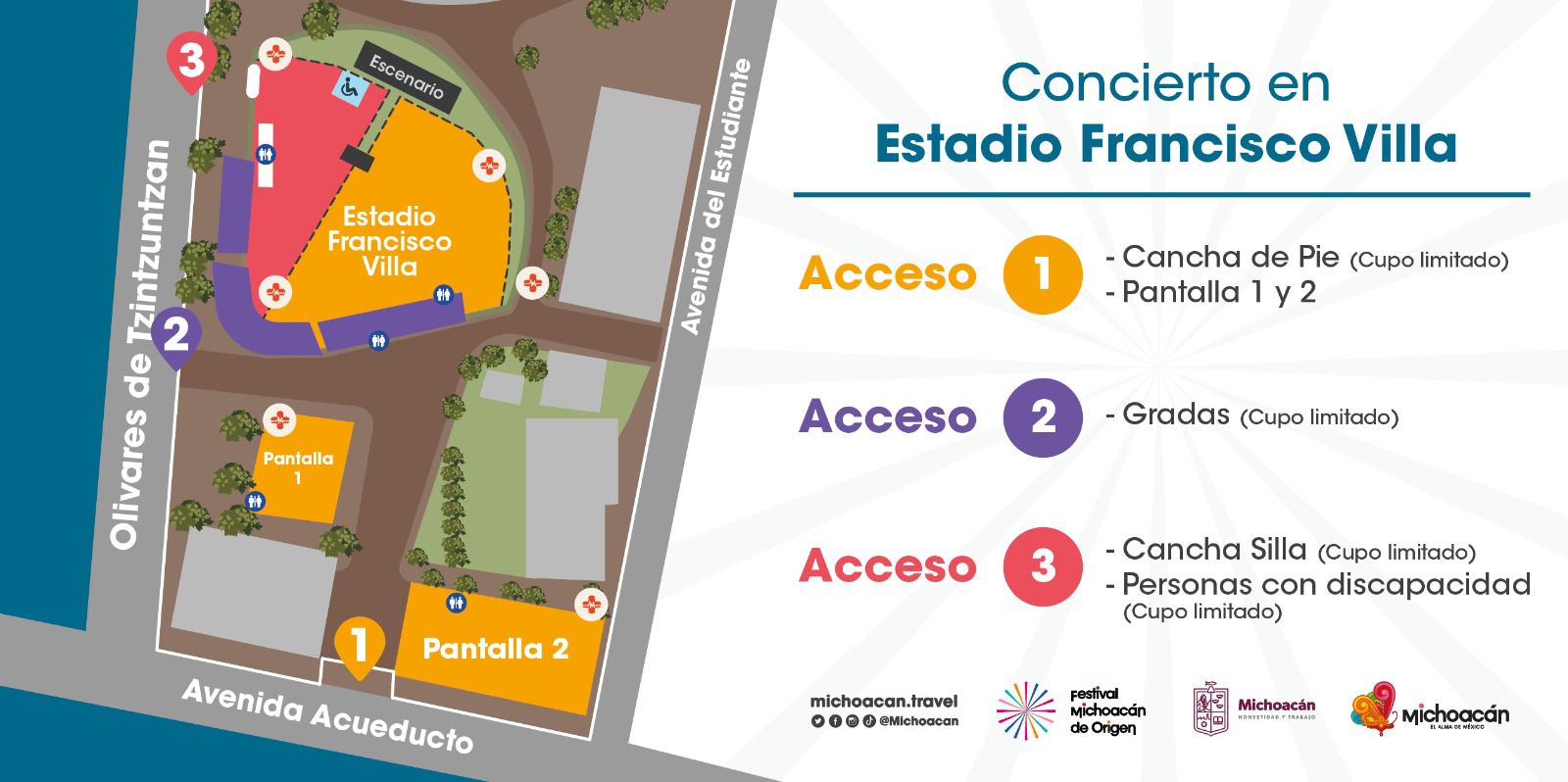 Los accesos al estadio Francisco Villa serán por la puerta de la avenida Acueducto, para la cancha sin sillería y zona de pantallas externas gigantes; por la calle Olivares de Tzintzuntzan, a la altura de la torre de la 21 Zona Militar, para ingresar a gradería; y por la calle Olivares de Tzintzuntzan, por el cajero de Banjército, para acceder la a cancha con sillería y para personas con discapacidad.