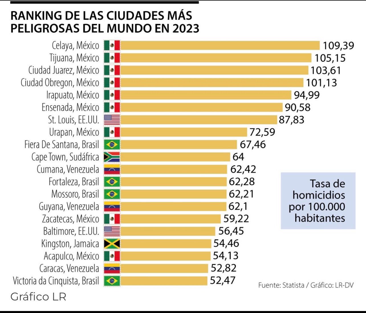 Después de México, Brasil, tiene cuatro municipios en el ranking, seguido por Venezuela con tres ciudades, Estados Unidos con dos, y tanto Jamaica como Sudáfrica con una cada uno.
