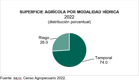 En la agricultura, los sistemas de riego se utilizan para un rendimiento óptimo del agua. Según el Censo Agropecuario de 2022, la superficie agrícola de nuestro país fue de aproximadamente 257 030.81 km2. De esta, 190 190.95 km2 (74.0 %) fueron de temporal, mientras que 66 839.86 km2 (26.0 %) correspondieron a la modalidad hídrica por riego.