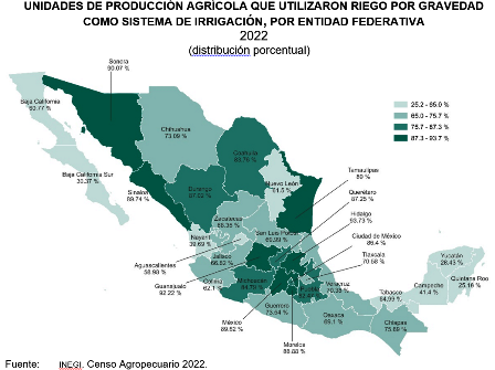 El Censo Agropecuario 2022 reportó 870 853 unidades de producción agropecuaria activas y con superficie de riego. En 66.75 % de estas, se preguntó sobre su sistema de irrigación. Los resultados definitivos arrojaron que 79.18 % de las unidades implementó el riego por gravedad; 12.76 %, por goteo, y 10.87 %, por aspersión.