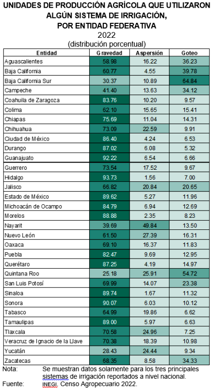 Nótese que, dentro de los sistemas de irrigación, el riego por goteo es un mecanismo eficiente para el ahorro de agua. Este se caracteriza por suministrar la cantidad necesaria para cada planta, por medio de un sistema de válvulas, tuberías y mangueras con emisores. De las 32 entidades federativas de nuestro país, solo en cuatro el sistema de irrigación principal no fue el riego por gravedad: en Baja California Sur y Quintana Roo el sistema principal fue por goteo, y en Nayarit, fue la aspersión. En Yucatán, el método fue riego por microaspersión.