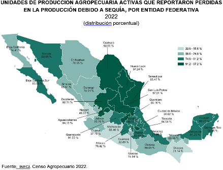 En 2022, la escasez del agua fue el principal factor que ocasionó pérdida a las unidades de producción agropecuaria activas en nuestro país. De aquellas unidades que presentaron problemas por algún factor climático o biológico, 72.19 % tuvo un siniestro climático debido a sequías y 12.76 % presentó inundaciones. De los factores climáticos asociados con el agua, en 31 entidades federativas la sequía fue el principal factor de pérdida para las unidades de producción agropecuaria activas en nuestro país. Las inundaciones solo se presentaron en Tabasco.