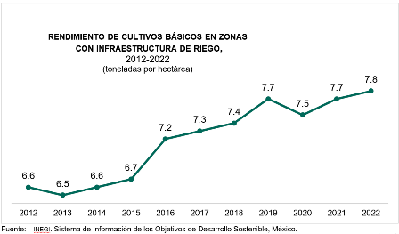 A medida que los sistemas de irrigación se han tecnificado, el aprovechamiento del agua para la producción de alimentos ha aumentado. Lo anterior puede observarse a partir de uno de los indicadores de los Objetivos de Desarrollo Sostenible, que da cuenta del rendimiento de cultivos básicos en zonas con infraestructura de riego.