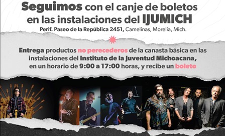 En rueda de prensa, dio a conocer que las entradas para Caifanes ya se agotaron y que los accesos para las otras dos bandas se entregan en las instalaciones del Ijumich, ubicadas en Periférico Paseo de la República 2451, colonia Bosque Camelinas, en Morelia, a cambio de productos no perecederos.