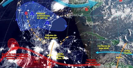 La onda tropical Núm. 11 recorrerá lentamente el sureste mexicano y en interacción con una zona de baja presión con probabilidad para desarrollo ciclónico localizada al sur de las costas de Oaxaca y Chiapas, y un canal de baja presión extendido sobre la Península de Yucatán, ocasionarán lluvias de fuertes a puntuales intensas acompañadas de descargas eléctricas en dicha península, así como en el oriente, sur y sureste de México.