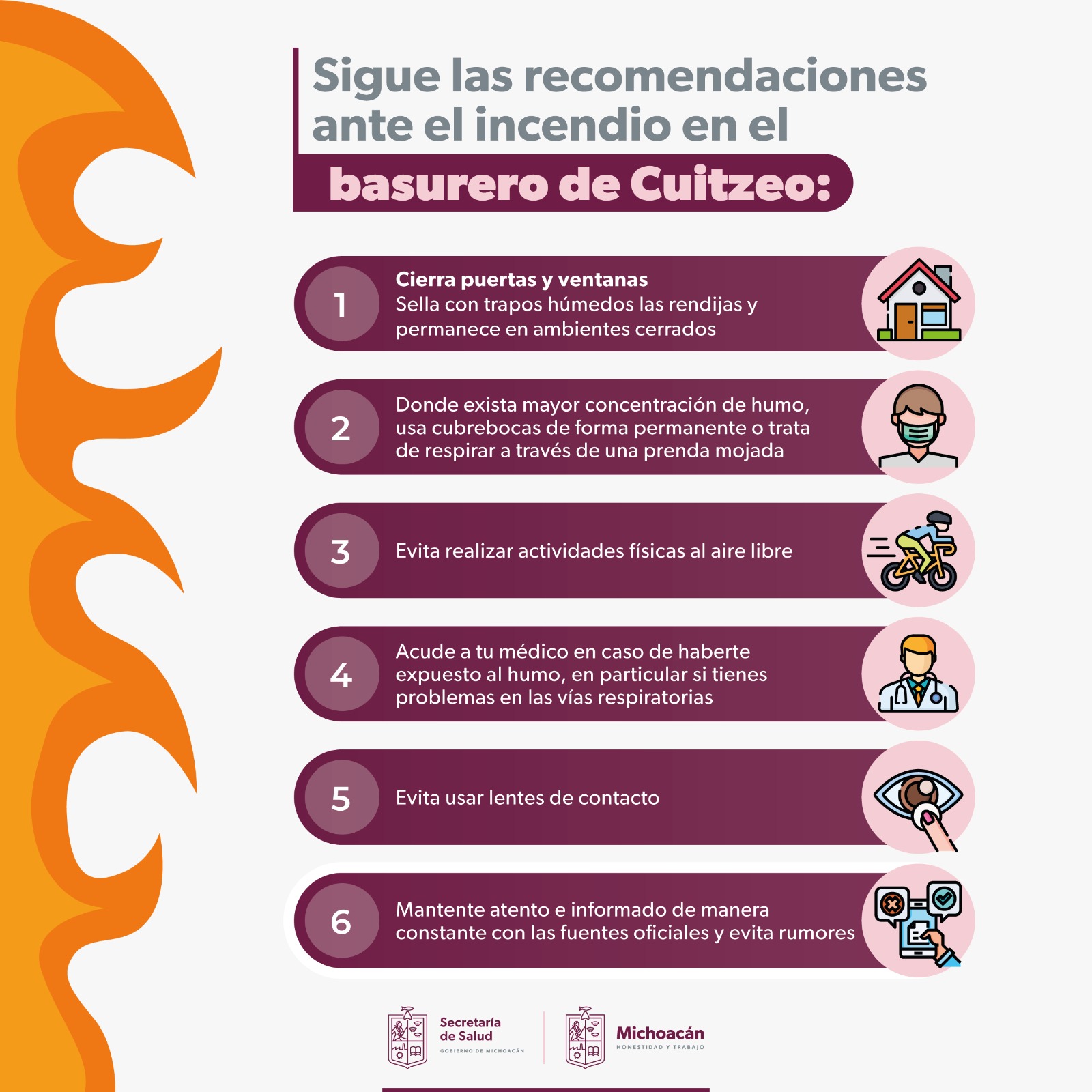 A través de la Jurisdicción Sanitaria número 1 Morelia, las coordinaciones de Servicios de Salud, Epidemiología, Promoción de la Salud y personal del Centro de Salud de Servicios Ampliados Cuitzeo, refuerzan las acciones a través de la visita a 585 casas de 38 manzanas de esa cabecera municipal cercanas al lugar al incendio, donde se le informa a la población sobre las medidas preventivas que deben implementar en sus hogares, para evitar se desencadenen enfermedades a consecuencia de la emisión del humo.