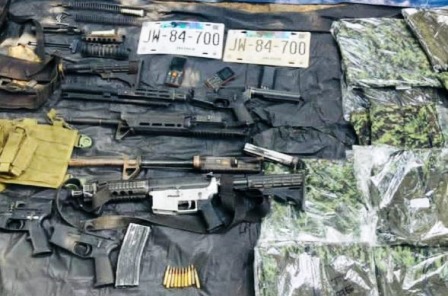 En el sitio fueron detenidos siete hombres y dos mujeres, y también fueron decomisados automotores de las marcas Nissan, Ford e Italika; así como un arma de fuego calibre .223 milímetros, un cargador, 10 cartuchos útiles, varias piezas de pistolas y prendas tácticas.