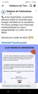 Carlos Maya, miembro de la citada asociación y de Activismo por el Bienestar Animal, lamentó que el ayuntamiento de Tzintzuntzan, anunciara en su página oficial el «retiro» de perros y gatos de las calles, pese a que, no cuenta con un centro de control canino.