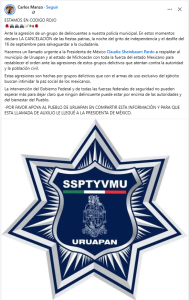 En sus redes sociales dio a conocer que tras las agresiones de las que fueron víctimas policías municipales por parte de grupos delictivos, buscando intimidar a la población es que se decidió cancelar los festejos patrios que incluían Grito y desfile.