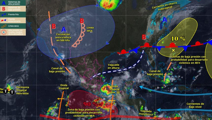Simultáneamente, una vaguada en altura sobre el occidente de México y el ingreso de humedad del océano Pacífico, generarán lluvias puntuales intensas con descargas eléctricas y posible caída de granizo en Nayarit, Jalisco, Colima y Michoacán. Por otra parte, el monzón mexicano, ocasionará lluvias e intervalos de chubascos con descargas eléctricas en Baja California, Sonora, Chihuahua y Durango con lluvias puntuales fuertes en Sinaloa. Asimismo, continuará el ambiente caluroso a muy caluroso sobre entidades del norte de la República Mexicana, estados del litoral del Pacífico, litoral del golfo de México y la península de Yucatán, con temperaturas superiores a 45 °C en Baja California, Sonora y Sinaloa. Finalmente, se mantendrá la onda de calor en zonas de Baja California, Baja California Sur, Sonora y Sinaloa.