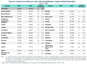 Al comparar con 2023, en 2024, la tasa de delitos por cada 100 mil habitantes bajó en cuatro entidades federativas, en 11 presentó un alza y en 17 no tuvo cambios. En 2024, nueve entidades federativas tuvieron tasas de incidencia superiores a la nacional.