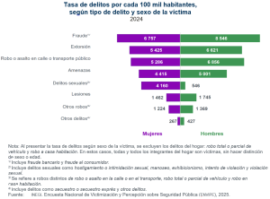 En 2024, el INEGI estimó que en 11.4 millones de hogares (29.0 % del total del país), al menos una o un integrante fue víctima del delito. Este porcentaje fue superior al de 2023. Para 2024, 23.1 millones de personas de 18 años y más fueron víctimas de delito: la cifra equivale a 24 mil 135 víctimas por cada 100 mil habitantes. La tasa para las mujeres fue de 23 mil 399 por cada 100 mil y, para los hombres, la cifra fue de 25 mil 010 por cada 100 mil.