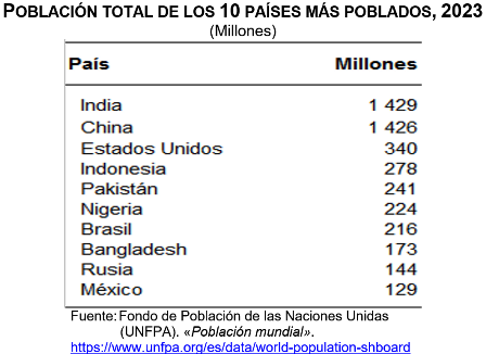 De acuerdo con los datos que proporciona el Fondo de Población de las Naciones Unidas (UNFPA, por sus siglas en inglés), en 2023 el volumen de la población mundial ascendió a 8 mil 045 millones, siendo India (mil 429 millones), China (mil 426 millones) y Estados Unidos de América (340 millones) los países más poblados. México ocupa el décimo lugar por volumen de población con 129 millones de personas.
