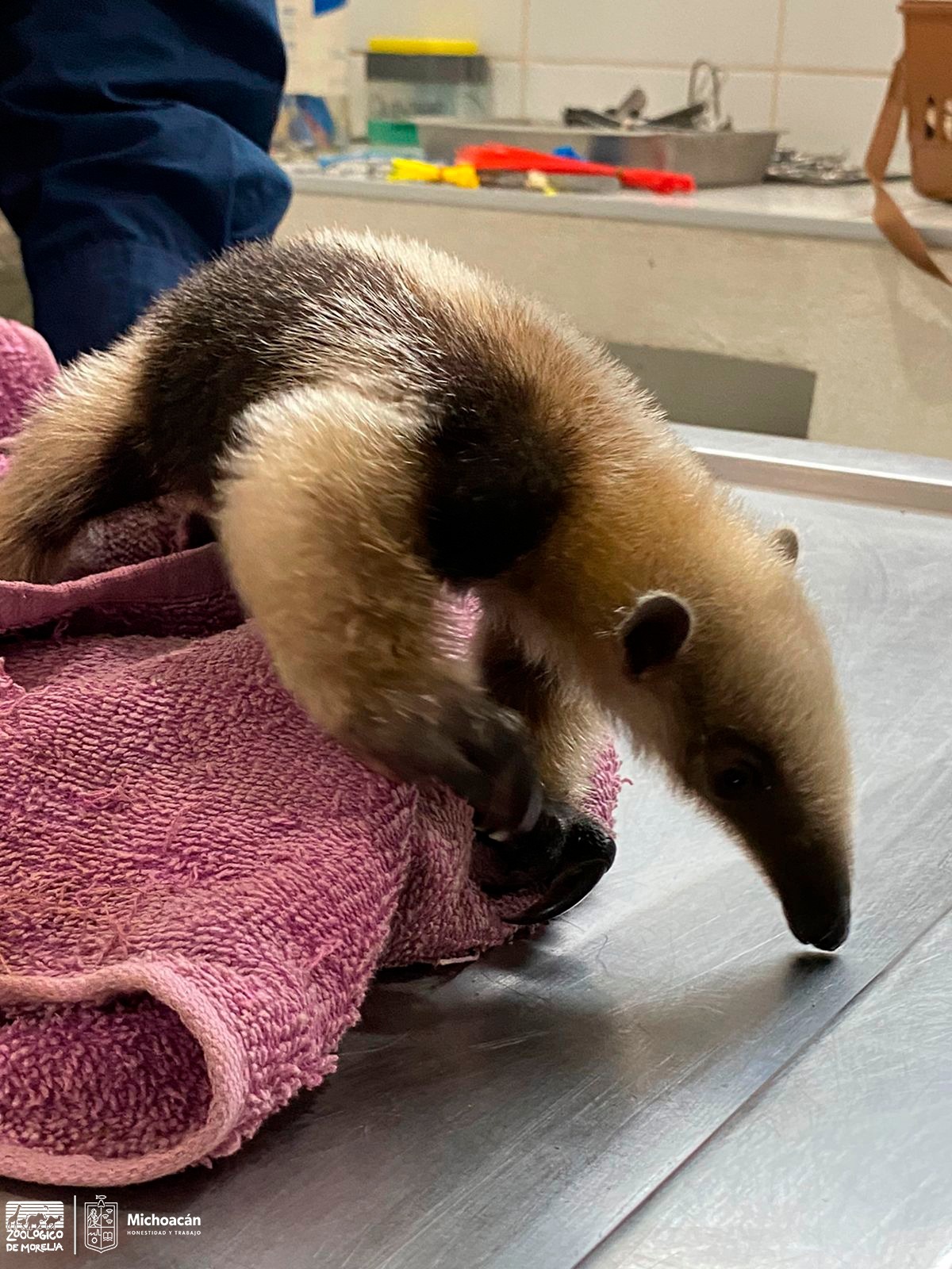 Indicó que el oso hormiguero es una cría de aproximadamente dos meses que llega aparentemente sin lesiones, pero sí con un cuadro de desnutrición al tener 24 horas sin alimento. Señaló que se revisará y se le intentará alimentar para estabilizarlo en las próximas horas.