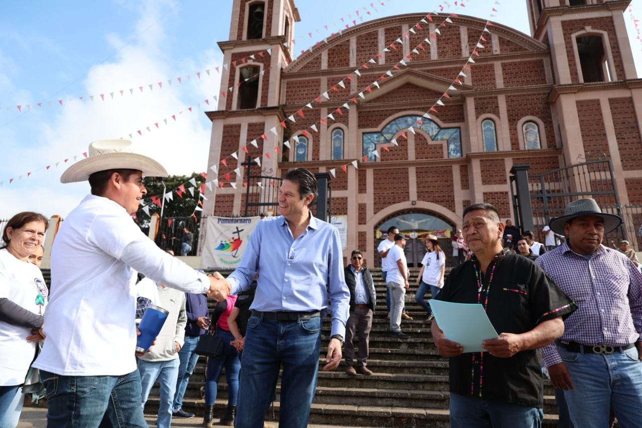 Los Reyes, Michoacán.- En la comunidad de San Juan Pamatácuaro, perteneciente al municipio de Los Reyes, el presidente de Morelia, Alfonso Martínez Alcázar, invitó a las y los habitantes de esta localidad ubicada en la Meseta Purépecha, a participar en las próximas ferias que se realicen en el capital para que expongan y pongan a la venta sus artesanías.