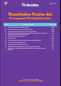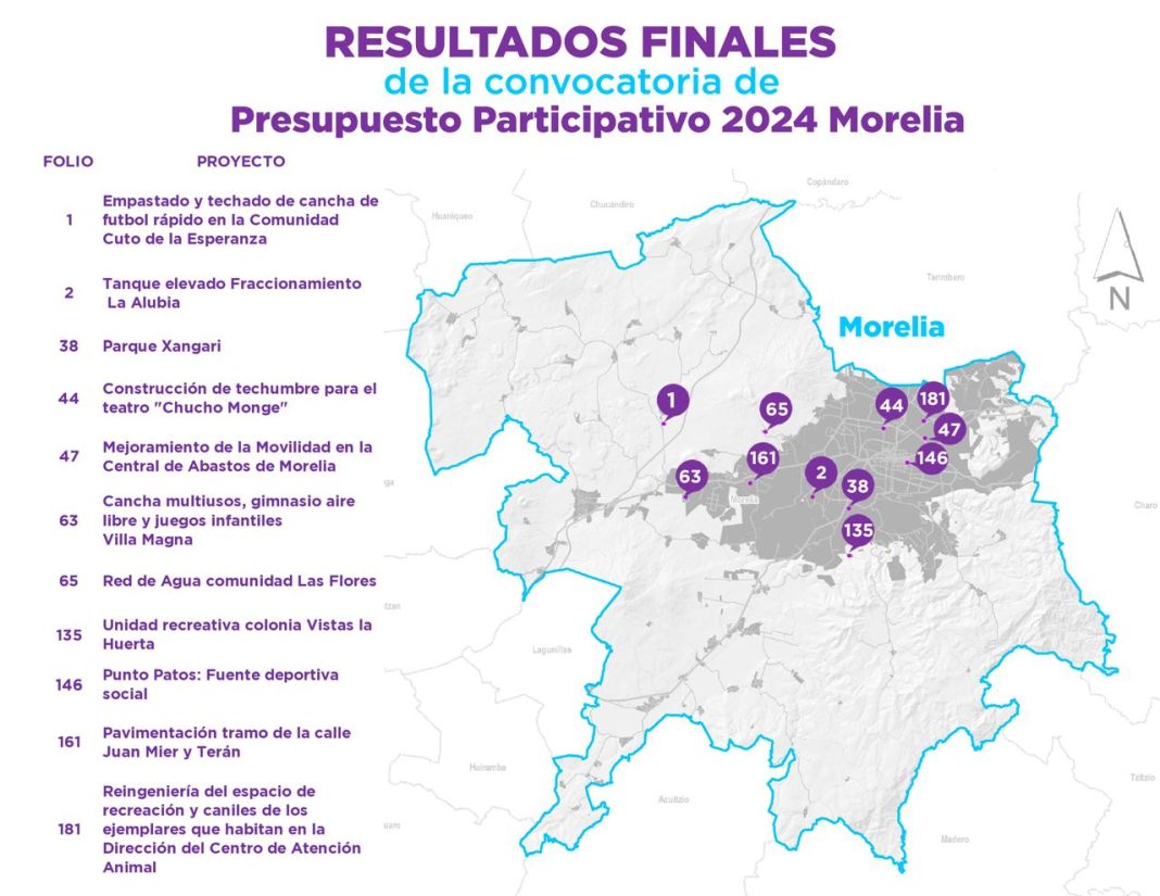 Se trata de un primer ejercicio en donde de manera libre se eligieron 11 proyectos por un monto de hasta 2 millones de pesos en el programa Presupuesto Participativo 2024 “En Morelia, tú decides”, concebido y promovido por el munícipe, Alfonso Martínez Alcázar.