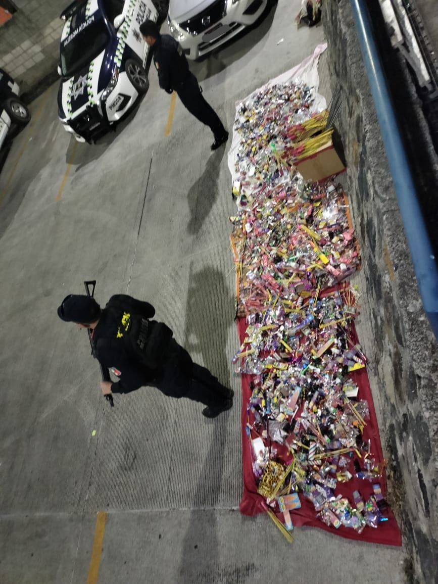 El material se encontraba a la venta en 9 puestos, los cuales no pudieron acreditar los permisos correspondientes por lo que se procedió al aseguramiento de aproximadamente 400 kilogramos de fuegos artificiales.