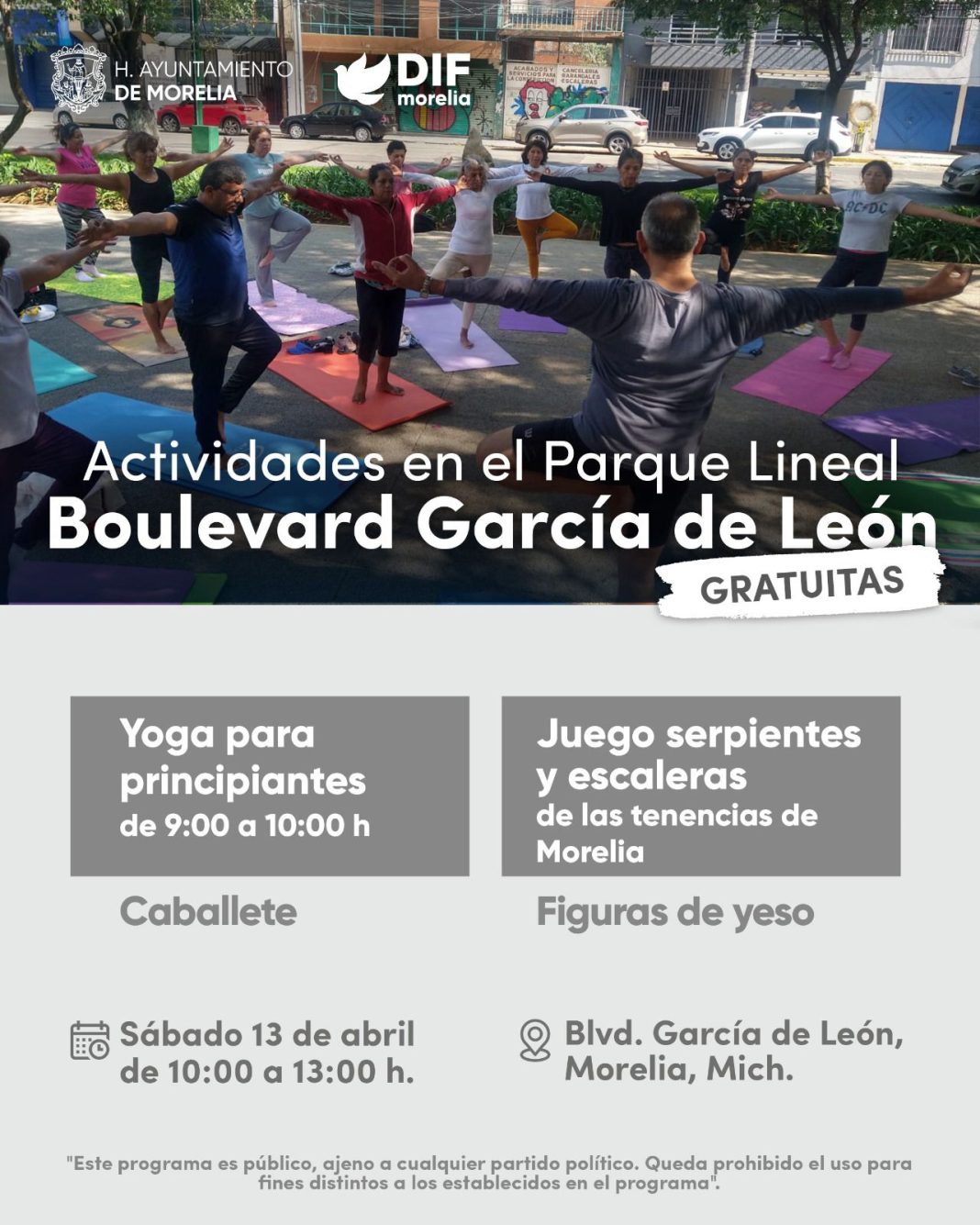 Con la finalidad de fortalecer el esparcimiento sano, familiar y cultural, el Gobierno de Morelia invita a la población a disfrutar de actividades gratuitas este sábado 13 de abril en el Boulevard García de León, a partir de las 9:00 y hasta las 13:00 horas.