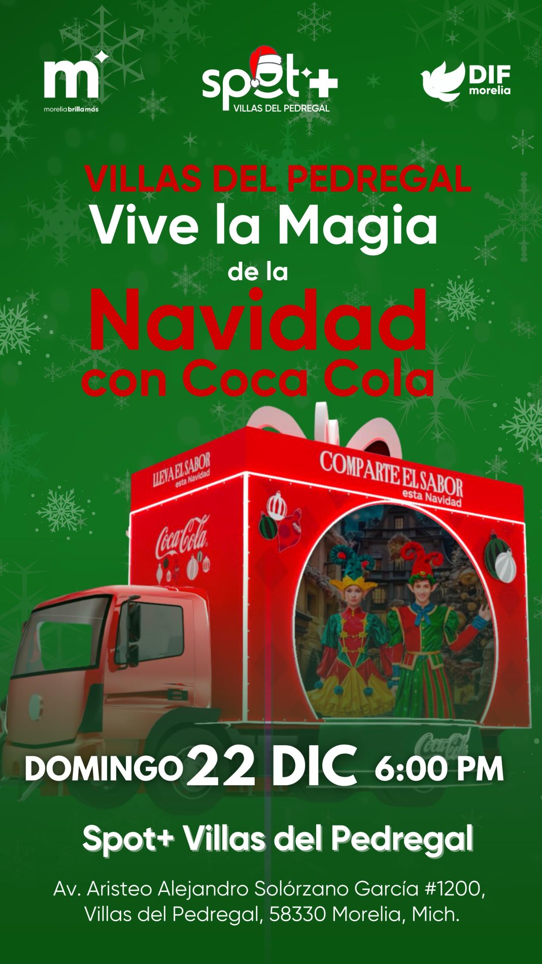Morelia, Michoacán.– Este domingo 22 de diciembre, el centro Spot+ Villas del Pedregal se llenará de magia navideña con la llegada del emblemático “Camión de la Felicidad” de Coca-Cola. Este evento, impulsado por el Gobierno del Presidente Municipal, Alfonso Martínez Alcázar, y el DIF Morelia, que encabeza la Presidenta Honoraria, Paola Delgadillo Hernández, busca llevar alegría y momentos inolvidables a las familias morelianas del poniente de la ciudad.