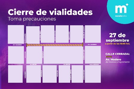 El concierto está programado para el 29 de septiembre y tendrá diferentes tiempos de intervención en los cortes de circulación; el jueves 28 de septiembre se ampliarán los cortes y será necesario cerrar el cruce de la calle Abasolo a Guillermo Prieto y Nigromante a Ignacio Zaragoza; mientras que el viernes el cierre sobre Avenida Madero se extiende, desde la vialidad Nigromante hasta Pino Suárez, así como calle Allende y Corregidora hacia el sur y norte, además de cierres intermitentes en la vialidad de Melchor Ocampo; de igual manera, el viernes por la noche, al finalizar el magno concierto, se tendrán cortes a la circulación en avenida Acueducto, desde Tata Vasco y sobre su continuación de la calle Real (Madero), hasta el monumento a Lázaro Cárdenas, para el desfile del sábado 30 de septiembre.