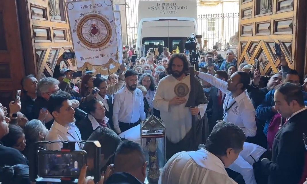 «Con los ojos de la fe» fue recibida en Catedral tras procesión desde la parroquia de Mater Dolorosa esta media mañana, la reliquia de San Judas Tadeo. Así ha llegado escoltada por fieles y sacerdotes a la sede religiosa donde le fue reservado un espacio en el cual permanecerá con su imagen hoy y hasta este jueves 16 de enero junto a las reliquias del beato Carlos Acutis y de San Rafael Guízar, en el marco de las ordenaciones sacerdotales que tendrán lugar mañana.