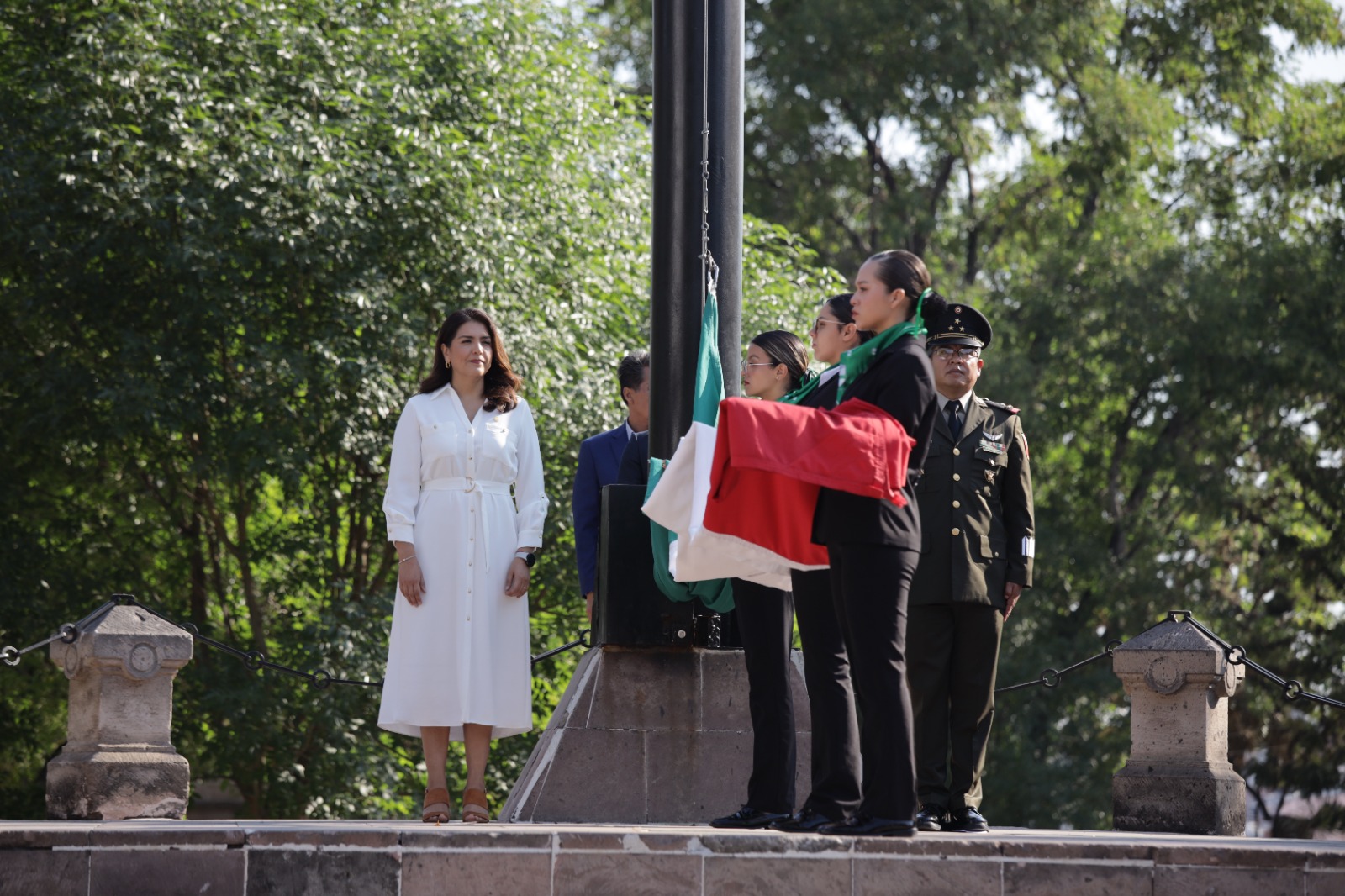 Morelia, Michoacán.- La Sindica municipal de Morelia y encargada del Despacho de la Presidencia, Susan Melissa Vásquez Pérez, acompañada de funcionarios municipales y estatales, así como de representantes de la Vigésima Primera Zona Militar y el Congreso del Estado, encabezó este sábado el izamiento de la Bandera Nacional, del municipio y del estado para dar inicio formal a la celebración del 483 Aniversario de Morelia.