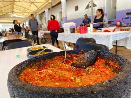 Después de probar la salsa y recorrer los stands donde los artesanos exhiben y venden sus piezas varias de molcajete, Martínez Alcázar sugirió a las cocineras que vendan en vasitos la salsa, y eso generará más ganancias y aumentara esta tradición.