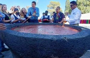 Así ha dado inicio este sábado la 8va Feria del Molcajete con esta salsita roja molcajeteada que es la más grande del mundo y fue vertida en el molcajete gigante que tiene una capacidad de 600 litros.