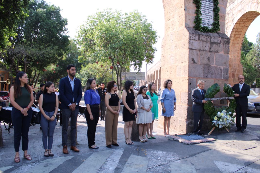 El acto fue encabezado por el director del Colegio de Morelia, Fernando Barrales y demás autoridades del municipio, quienes montaron guardia de honor y colocaron una ofrenda floral al arranque del Acueducto y de la Calzada Fray Antonio de San Miguel, que lleva su nombre.