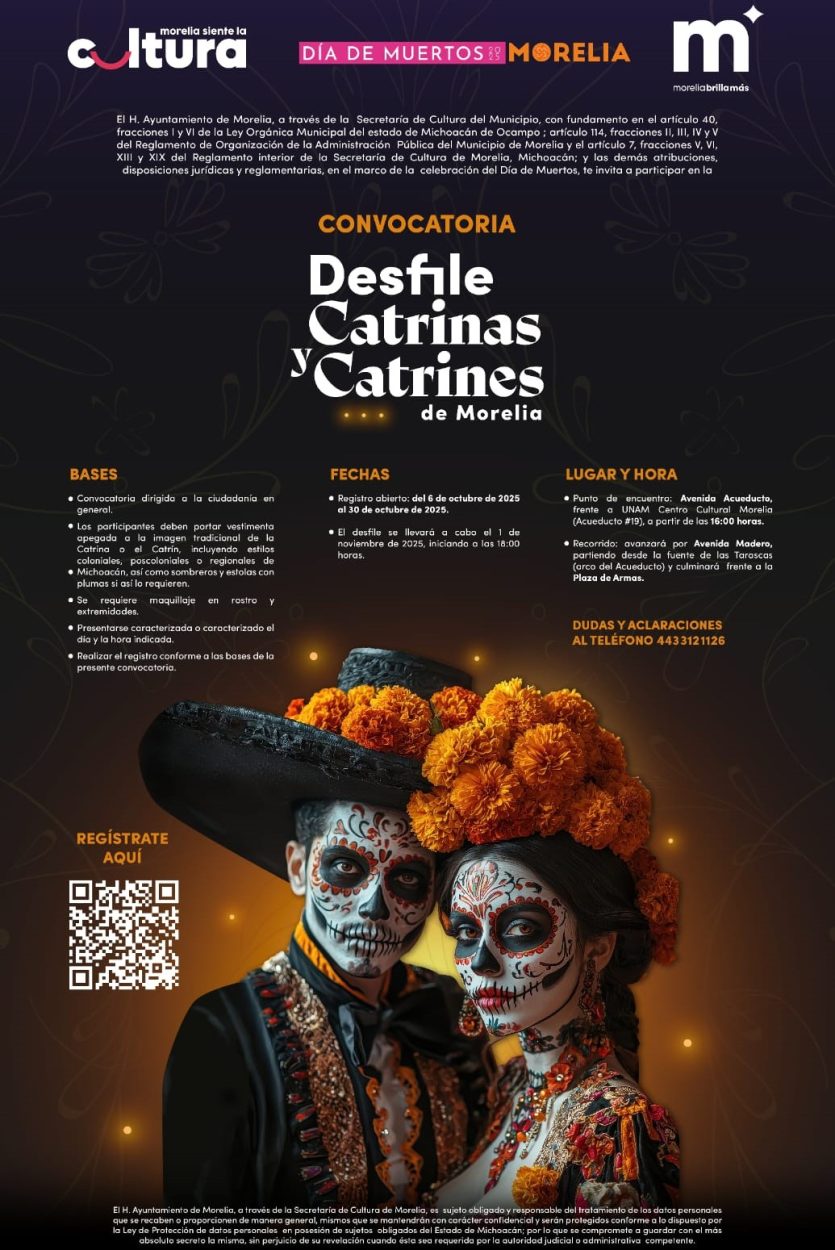 El Gobierno de Morelia que encabeza el presidente municipal, Alfonso Martínez Alcázar, por medio de la Secretaría de Cultura (Secultura) reitera la invitación a la ciudadanía en general para participar en la edición 2025 del Desfile de Catrinas y Catrines, que se realizará el próximo primero de noviembre en el centro histórico.