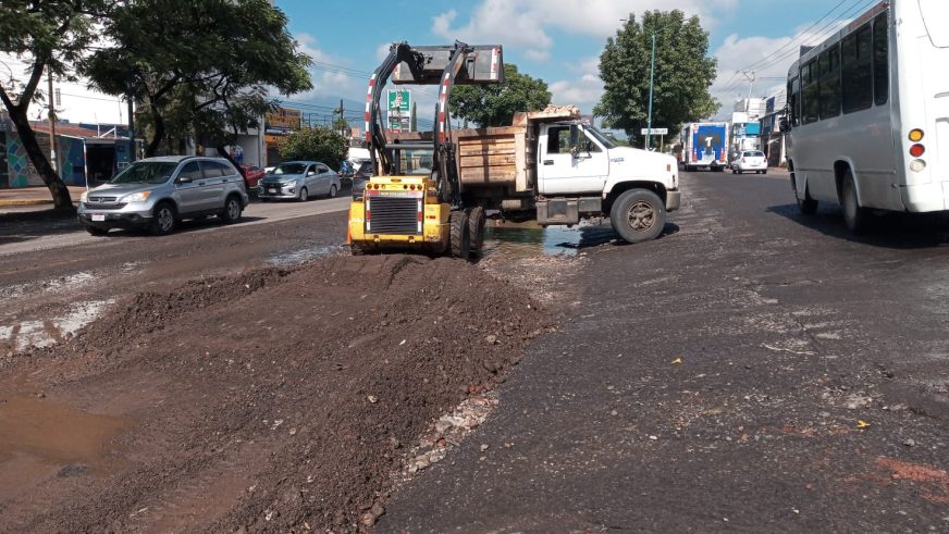 Brigadas de la Secretaría de Servicios Públicos, trabajan en el retiro de tierra que fue arrastrada durante las lluvias, en las laterales de la salida a Quiroga, sobre la avenida Madero.
